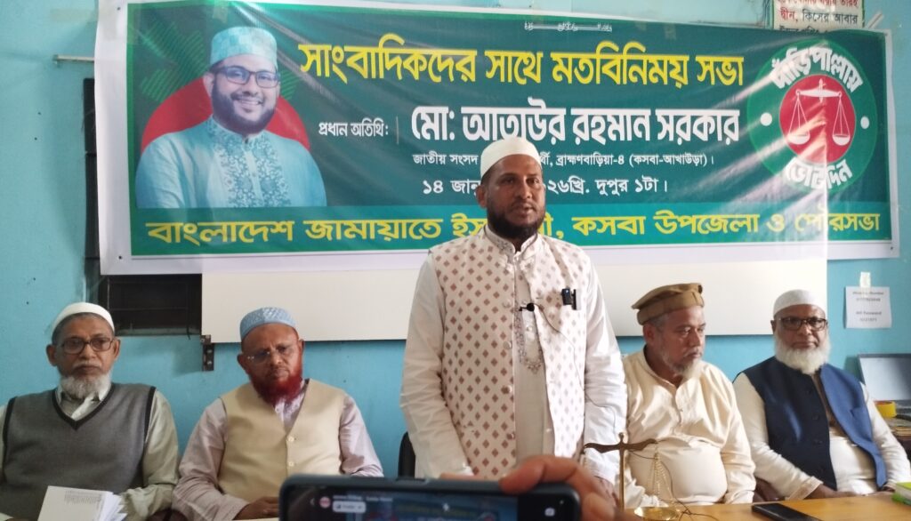 ভজন শংকর আচার্য্য, কসবা (ব্রাহ্মণবাড়িয়া) প্রতিনিধি  ॥ গত বুধবার  (১৪ জানুয়ারি) দুপুরে  উপজেলা জামায়েতে ইসলামী কার্যালয়ে সাংবাদিকদের সাথে এক মতবিনিয় সভা অনুষ্ঠতি হয়। উপজেলা আমির  অধ্যক্ষ মোঃ  ফরিদ উদ্দিনের সভাপতিত্বে মতবিনিময় সভায় প্রধান অতিথি  ছিলেন জাতীয় সংসদ সদস্য পদর্প্রাথী ব্রাহ্মণবাড়িয়া-৪ (কসবা-আখাউড়া) মো: আতাউর রহমান সরকার।