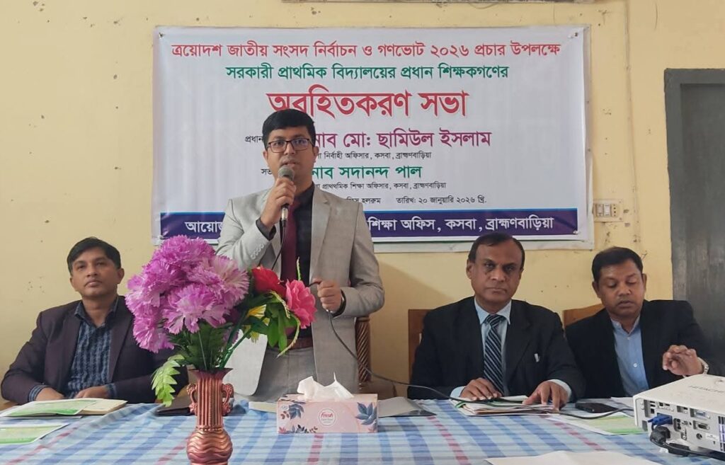 কসবা (ব্রাহ্মণবাড়িয়াা) প্রতিনিধি ॥ গত মঙ্গলবার (২০ জানুয়ারি) সকালে ১০ টায় আসন্ন ত্রয়োদশ জাতীয় সংসদ নির্বাচন ও গণভোট ২০২৬ প্রচার উপলক্ষে কসবা উপজেলা প্রাথমিক শিক্ষা অফিস কার্যালয়ে উপজেলার সরকারি প্রাথমিক বিদ্যালয়ের প্রধান শিক্ষকগণের অবহিতকরণ সভা অনুষ্ঠিত হয়।
