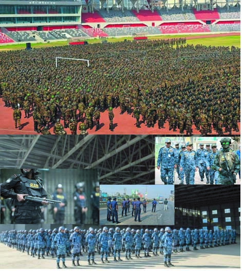 নির্বাচনি দায়িত্বে বিভিন্ন বাহিনীর সদস্যরা ইতোমধ্যে অবস্থান নিয়েছেন। ‘ইন এইড টু দ্য সিভিল পাওয়ার’-এর আওতায় সেনাবাহিনীকে আগেই সারা দেশে মোতায়েন করা হয়েছে। তারা টহল দিচ্ছেন গুরুত্বপূর্ণ এলাকায় এবং পরিচালনা করছেন নির্বাচনি মহড়া। একইসঙ্গে অবৈধ অস্ত্র উদ্ধারে চলছে যৌথবাহিনীর বিশেষ অভিযান।